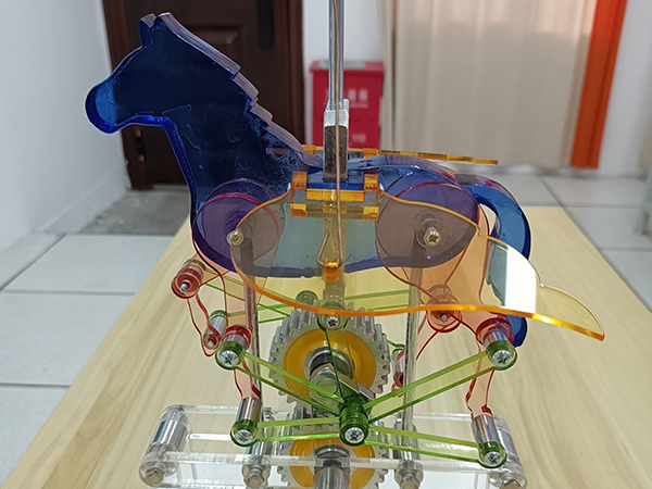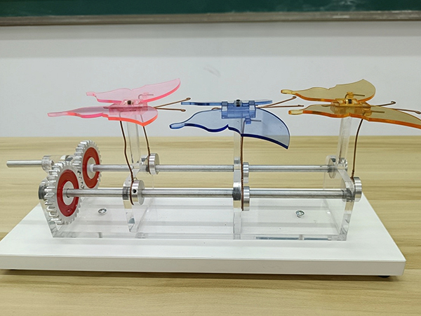 2019级学生蔡智鸿、王潇华、肖博宇、雷宇锋、金健制作的作品《仿生机械飞马》获一等奖;2020级学生郭露、刘珈祯、余李程、陈宋基、汪卓压制作的作品《仿生机械蝴蝶》获二等奖。他们围绕“自然和谐”的创作主题,根据专业课所学知识,以齿轮、摇杆、连杆、曲柄等零件组成了作品的传动装置,通过推动手柄带动齿轮转动,继而牵动曲柄摇杆机构,模仿出动物的运行轨迹。奔腾飞翔的马儿、挥舞双翅的蝴蝶,以巧妙的机械结构,呈现了自然的梦幻与美好。两件作品的指导老师分别是朱锐和梁荆璞。