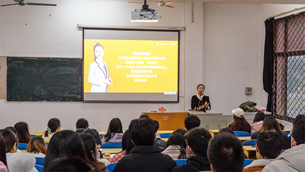 本网讯 近日,人文与传媒学院在1-114多媒体教室举办招聘宣讲会,为学生提供就业信息,搭建毕业生与用人单位双向选择平台。人文与传媒学院校友、深圳某国际文化传媒有限公司员工李兰兰通过短视频、PPT、室内互动等形式,从就业现状、岗位需求、职业发展、行业经验、薪资待遇、企业文化等方面展开宣讲。人文与传媒学院党总支书记李成军分享了自身从教生涯和工作经验,鼓励同学们努力学习专业知识,强化专业技能,提升职业素养,早就业、稳就业、就好业。(通讯员 梁玥 摄影报道)