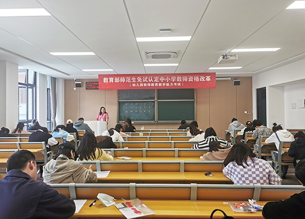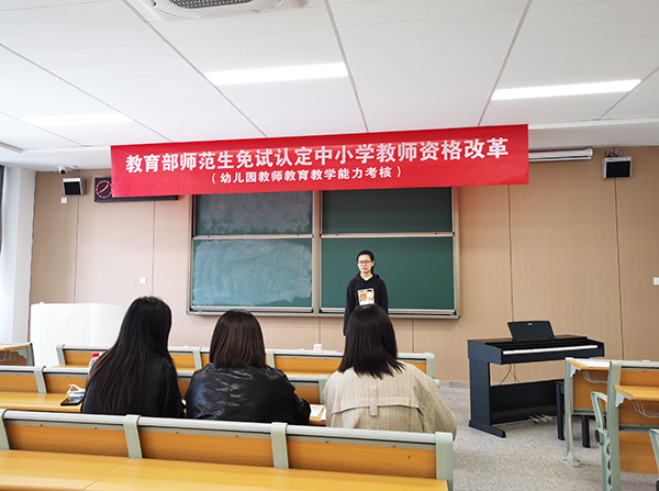 本网讯 4月8日,教育与心理学院举行幼儿园教师教育教学能力考核,共有39名学生申请参加考核。考核共设4个考场,1个笔试考场和3个面试考场。笔试题目参照国家教师资格考试标准和大纲,综合考察师范生职业理念、教育法律法规、教师职业道德规范、文化素养和基本能力等。面试采取讲课、说课、模拟教学活动设计等方式,考核申请人的教师基本素养及教学设计、教学实施、教学评价水平等。考核结束后按成绩排名划定通过比例,由学校颁发《师范生教师职业能力证书》。该考核是根据《教育部关于推进师范生免试认定中小学教师资格改革的通知》要求,面向我院学前教育专业学生设置。(图文由教育与心理学院提供)
