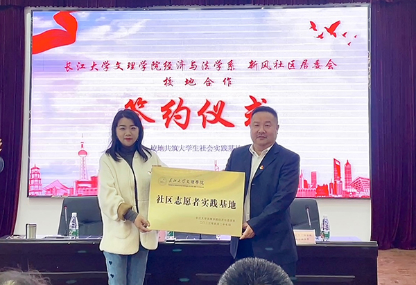 本网讯 近日,经济与法学系和新风社区居委会校地合作签约仪式在社区居委会会议室举行。经法系党总支副书记杨杉杉和新风社区居委会负责人代表单位签订了校企合作框架协议,经法系向新风社区授予“社区志愿者实践基地”牌匾。此次签约授牌为校地双方提供了进一步交流合作的平台,有利于经法系学生在课余走出校园、走进社会、服务地方,获得锻炼和成长。经法系辅导员和一批志愿者、新风社区工作人员参加活动。(图文由经法系提供)