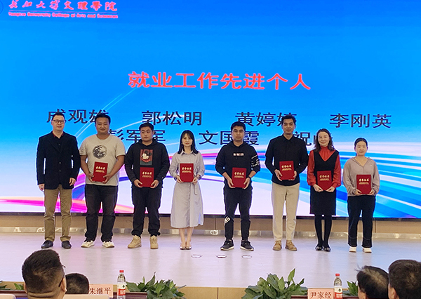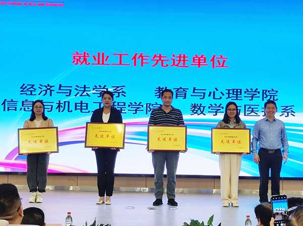 副院长尹家经宣读了2022年毕业生就业工作表彰文件,经济与法学系、教育与心理学院、信息与机电工程学院、数学与医护系获就业工作先进单位,成观雄、郭松明等七人获就业工作先进个人,副院长康建虎、孙细望分别为获奖单位和个人颁奖。