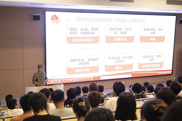 近期,各教学单位纷纷组织校老兵团代表到学生中间宣讲征兵政策,号召青年大学生参军入伍,报效国家。(图片由学工部提供)