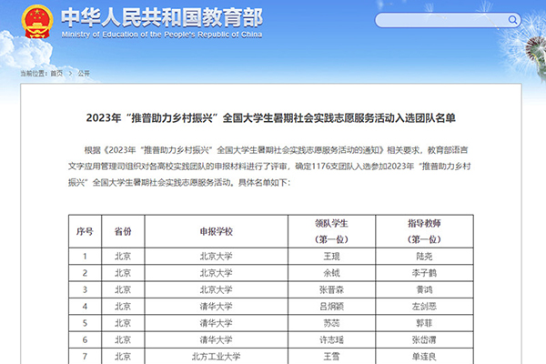 本网讯(通讯员 丁欣蓉)近日,教育部公布2023年“推普助力乡村振兴”全国大学生暑期社会实践志愿服务活动入选团队名单:我院管理学院志愿者服务队入选。