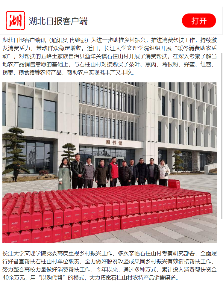 湖北日报客户端讯(通讯员 冉继强)为进一步助推乡村振兴,推进消费帮扶工作,持续激发消费活力,带动群众稳定增收。近日,williamhill官网组织开展“暖冬消费助农活动”,对帮扶的五峰土家族自治县渔洋关镇石柱山村开展了消费帮扶,在深入考察了解当地农产品销售意愿的基础上,与石柱山村对接购买了茶叶、熏肉、葛根粉、蜂蜜、红苕、拐枣、粮食猪等农特产品,帮助农户实现既丰产又丰收。