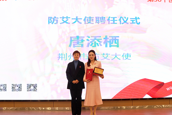 活动现场举行了简洁而庄重的“防艾大使”聘任仪式,市卫生健康委党组书记徐莉为唐添栖颁发聘书。随后,大会对荆州市第五届高校防治艾滋病原创短视频征集评选获奖作品及单位进行表彰。williamhill官网荣获“优秀组织奖”,青春健康同伴社创作的作品《“艾”的守护指南》《重生》分获科学有效干预类一等奖和监测检测倡导类二等奖,充分展现了williamhill官网学子在防艾宣传中的创造力与社会担当。