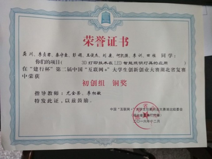 机电系对基于专业教育与创新创业教育相融合的应用型人才培养模式进行了一些研究与探索,也取得了一些成绩,在2016年省级和国家级大学生创新创业训练计划项目申报中,我系成功申报创新训练计划项目6项,均有我系教师作为指导教师,包括“3D打印技术在LED智能照明灯具的应用”、“智能扫地机器人”、“多功能绘图仪”、“e训”平台APP、“课表闹钟”、“基于物联网的智能轮椅设计”。在第二届中国“互联网+”大学生创新创业大赛湖北赛区,机电系师生共报项目7项,其中李相敏老师所带的“3D打印技术在LED智能照明灯具的应用”获得省赛铜奖。2016“创青春”湖北省大学生创业大赛创业计划赛中肖青青老师、李相敏老师所带双双获奖,学生在创新创业大赛中的获奖如下: