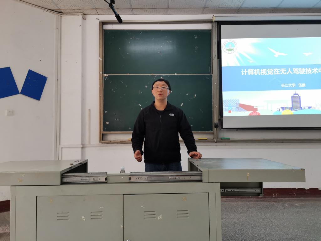 本网讯(学生记者 湛点)10月28日,在西校区四教200教室,我系开展“计算机视觉在无人机驾驶技术中的应用”学术讲座。讲座由系主任付兵主持,长江大学教授伍鹏主讲,系辅导员成观雄,办公室干事徐艾晨出席,我系19级、20级部分学生参加。