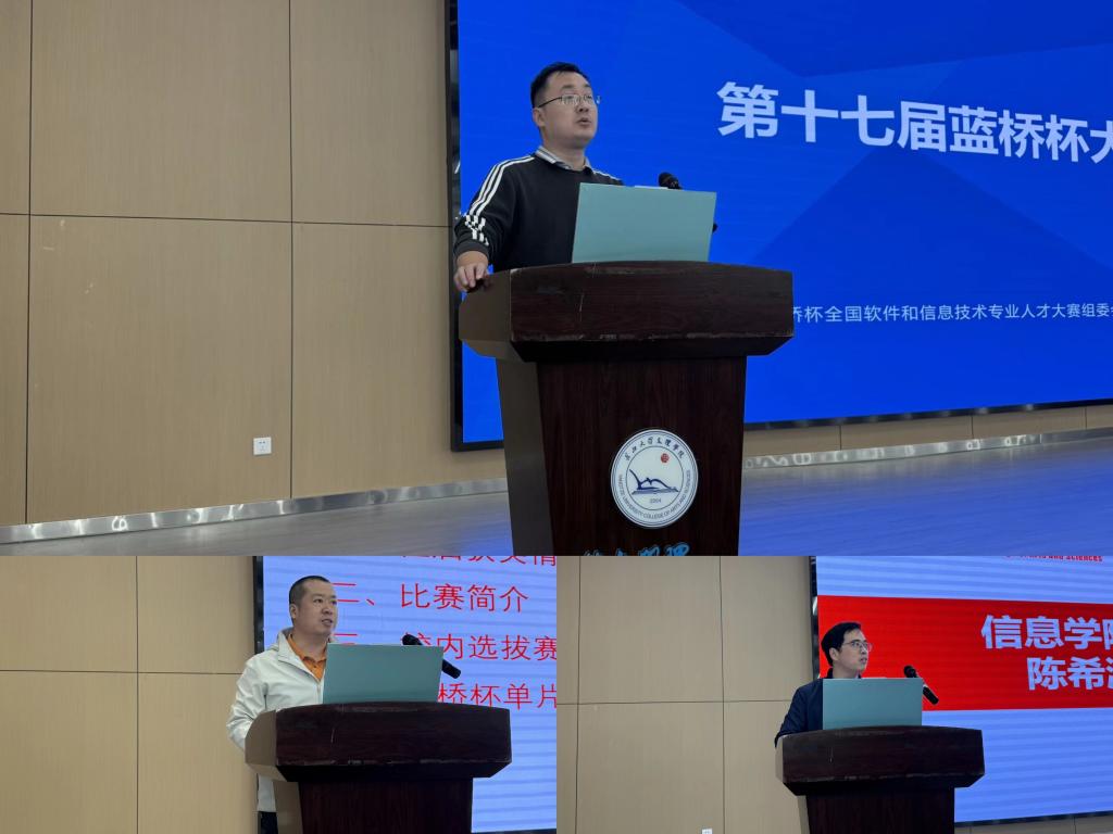 随后,呙明辉对蓝桥杯竞赛进行介绍,他列举了学院在蓝桥杯竞赛上所取得的优异成绩,介绍了参赛流程,鼓励更多计算机学子积极参与竞赛,建议大家应“找准自己的赛道”,明确目标,不断前行,取得优异成绩。紧接着,朱嵘涛老师细致介绍了大赛项目类别及校内选拔赛的时间和方式,重点强调了在参赛中学生应该具备的能力,并指出了广大学员在学习备考中存在的问题。