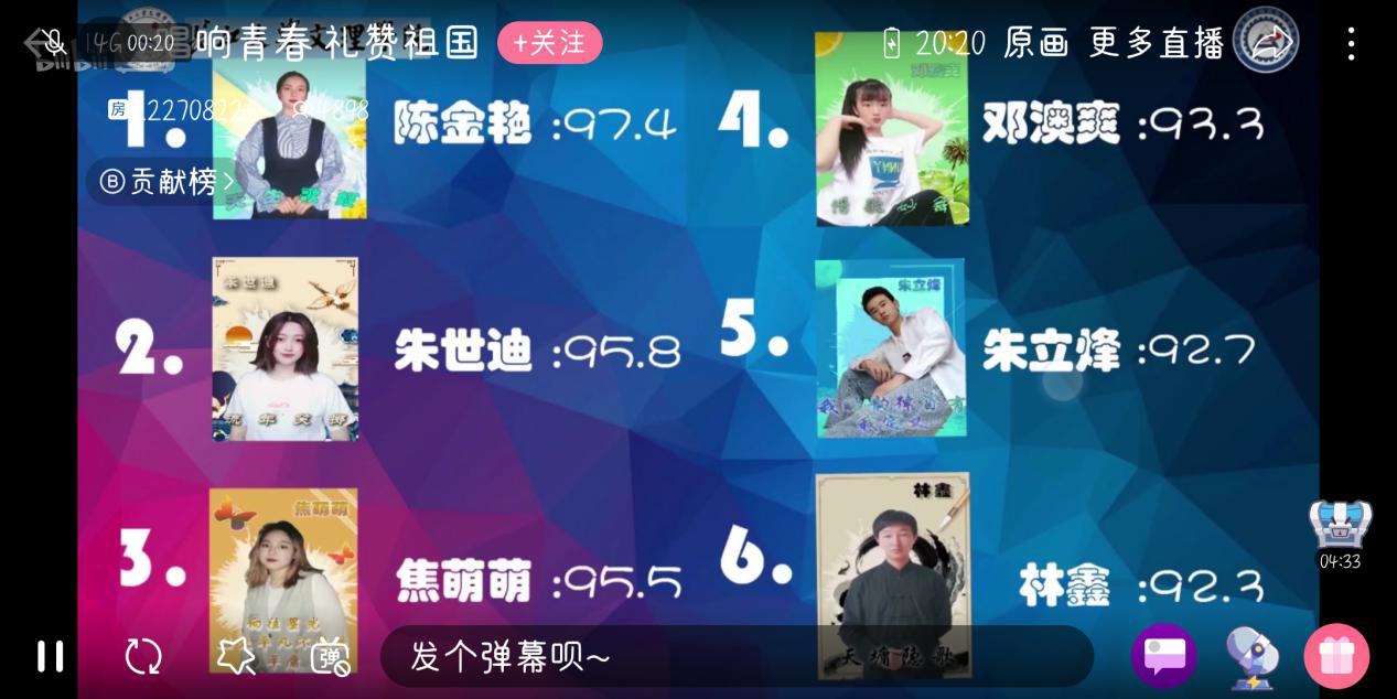 本网讯(学生记者 刘文婷)5月28日晚七点,在哔哩哔哩线上直播平台,由我系承办的第十四届“泮池五月风”科技文化节之“唱响青春,礼赞祖国”校园歌手大赛闭幕式如期隆重举行。比赛由物联5191孔宝宝主持,特邀学生工作部副部长、心理中心主任李刚英、人文系副主任徐霄、机电系王琳、经法系熊慧、设计系鲁倩五位老师担任评委。在这里,同学们的歌声唱响、音符飘扬、青春激荡、梦想起航,现场气氛点燃,激情与梦想不断擦出火花,在线观众人数高达五千多人。