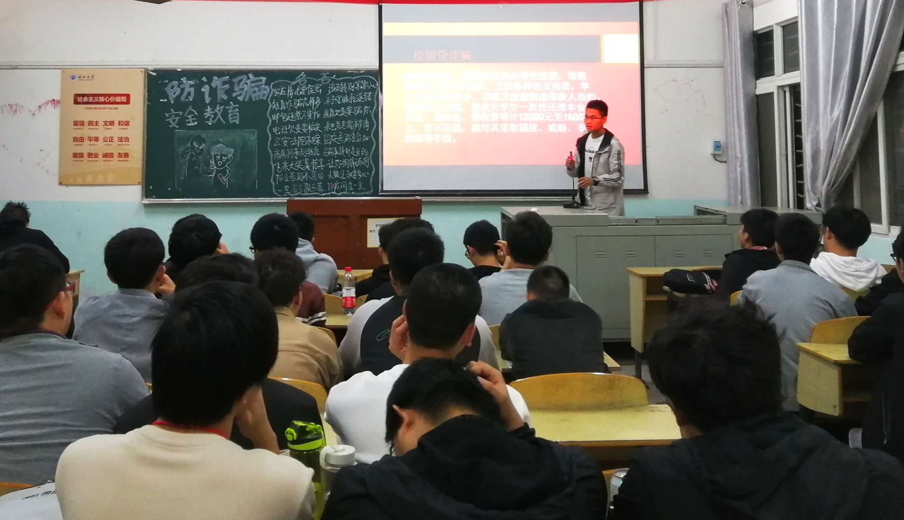 班会上,主持人通过讲解一系列诈骗事件,并结合大学生实际情况呼吁同学们增强防范意识、学会辩识真假,做到不轻信、不忙信。随后,辅导员告诫同学们,应牢牢树立安全意识,掌握辨别真假的能力,自觉抵制诱惑,对诈骗方式基本的了解,沉着冷静,学会说“不”。
