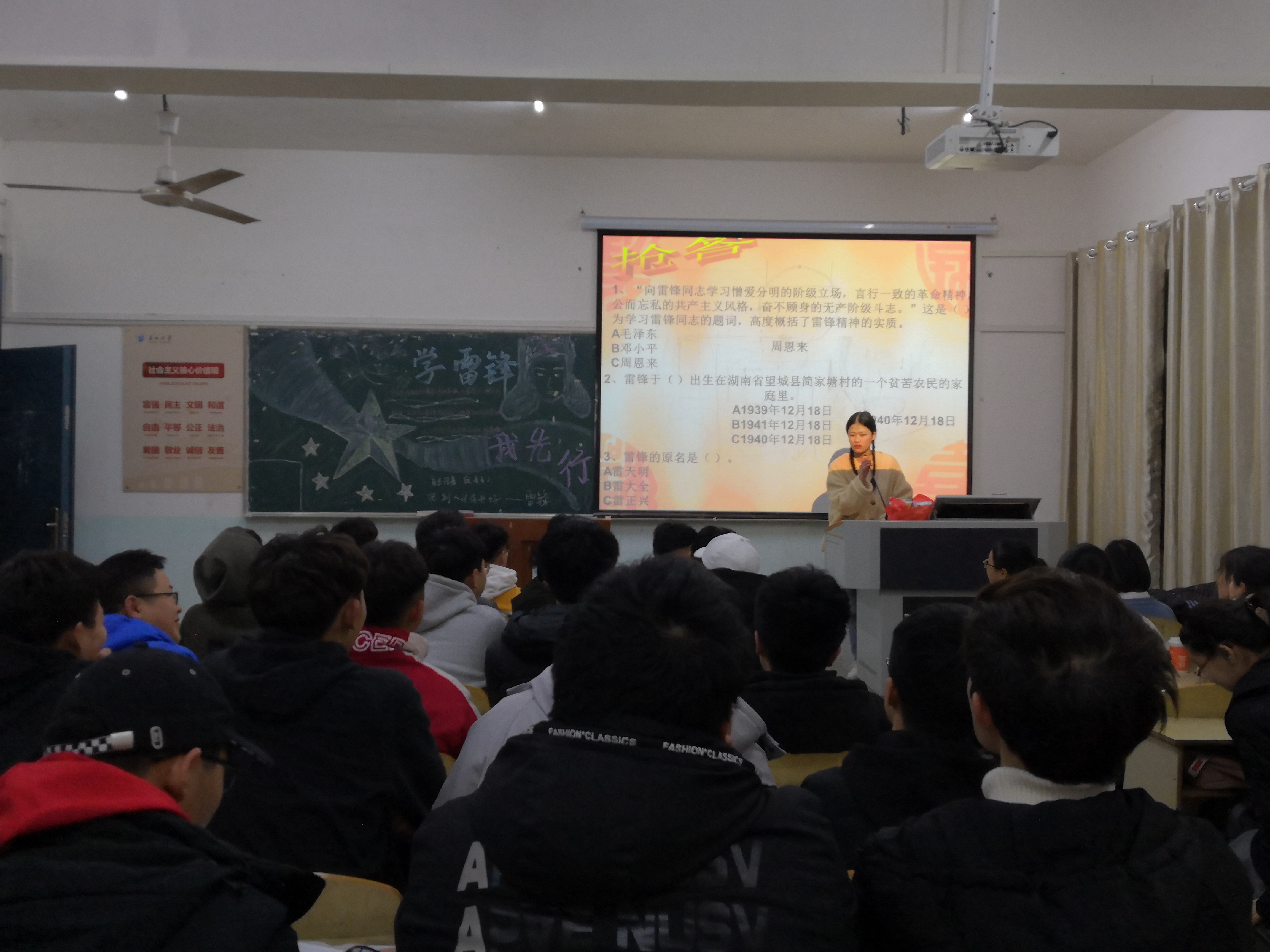 团课伊始,各班主持人通过观看视频带领大家回顾雷锋同志曾经为人民服务的点滴事件,一个个场面的再现让大家不禁唏嘘赞叹。接着,以知识竞答的形式组织同学们系统学习雷锋精神,现场气氛热烈。大家纷纷表示,作为新时代大学生,学习雷锋,要深入了解其精神内涵,用实际行动来弘扬和谐之风,像雷峰那样在日常生活中勤俭朴素、无私奉献、团结友爱、努力学习。做中华民族传统美德的传承者,新时代道德规范的践行者。