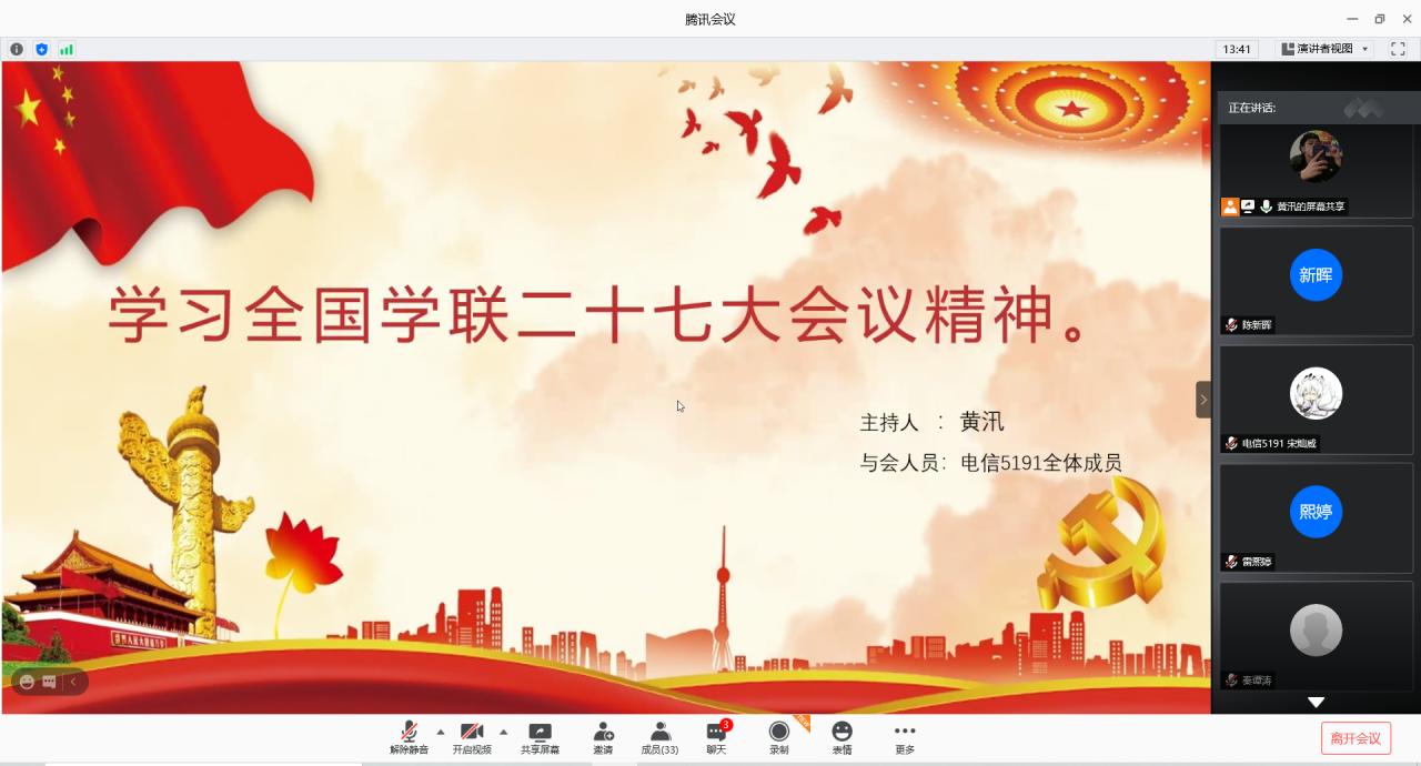 本网讯(学生记者 漆丽华)为继承和发扬中国青年运动的光荣传统,志高存远、脚踏实地,不断成长为能够担当民族复兴大任的时代新人。917日晚,在腾讯会议平台,我系各班组织开展“学习全国学联二十七大会议精神”团课,各班团支书主持,辅导员成观雄、燕梦蝶出席,班级全体成员参加。