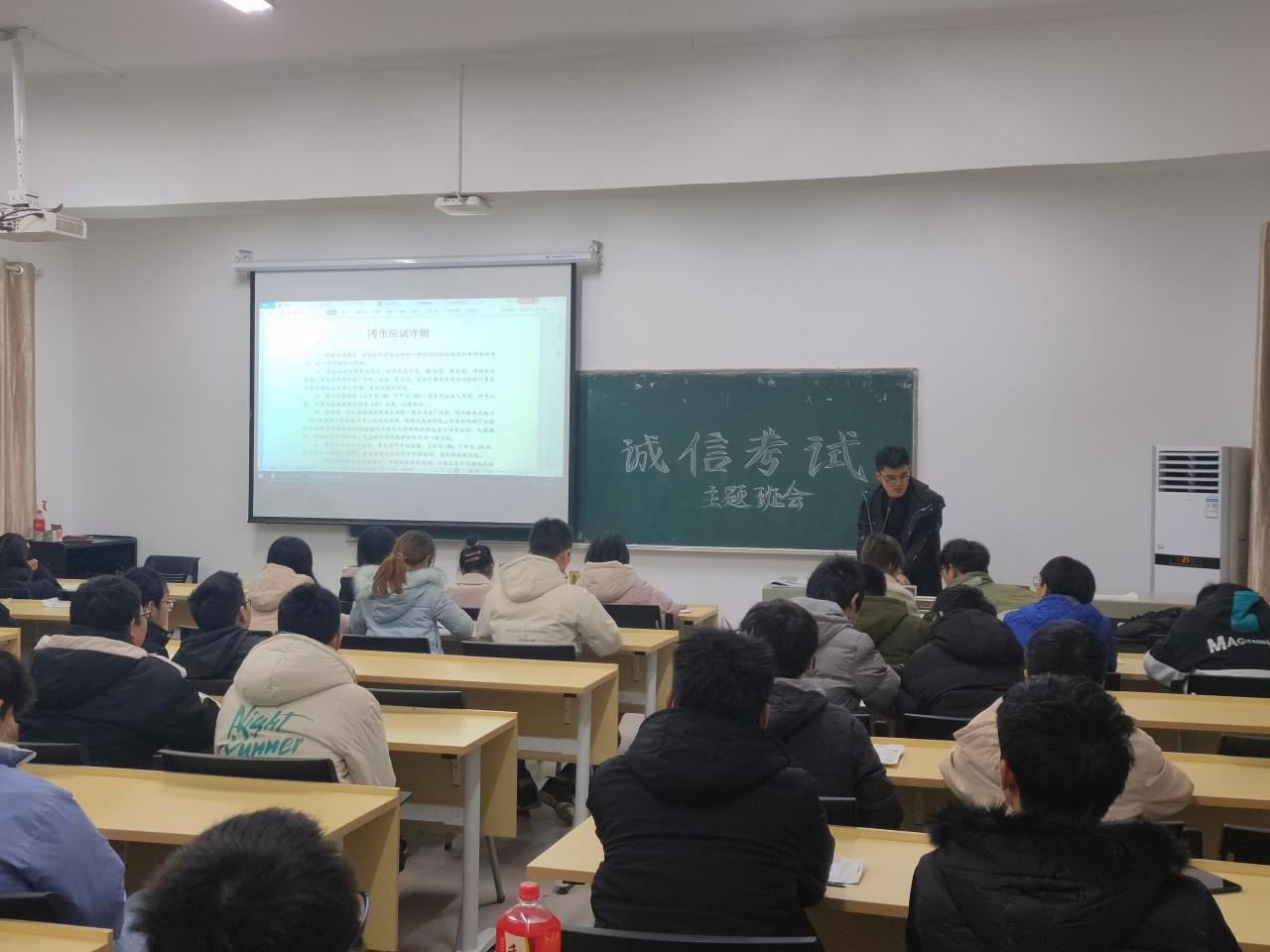 班会上,主持人带领同学们阅读官网上发布的四六级公开信,详细介绍大学英语四六级考试考生应试守则、我院学生违纪处分办法,并着重强调英语四六级的重要性。他告诫同学们要杜绝考试违纪作弊行为,树立良好的考风考纪,用真实的实力,考出真实的水平,同时还叮嘱同学们带好考试相关证件和用品,祝愿大家取得好成绩。