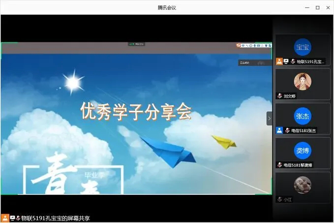 6月28日晚,在腾讯会议平台,我系召开线上优秀学子分享会。会议特邀电信5161宋博武、电工5161柳迪两位优秀毕业生作经验分享,物联5191孔宝宝担任主持,300余名师生一同参与。