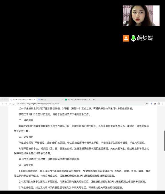 本网讯(学生记者 杨烁 孙健博)为贯彻落实我院疫情防控工作,提高同学们的自我保护能力,近日,在腾讯会议平台上,我系召开春季学期开学专题线上班会。会议由各班团支书主持,班级辅导员出席,全班同学参与。