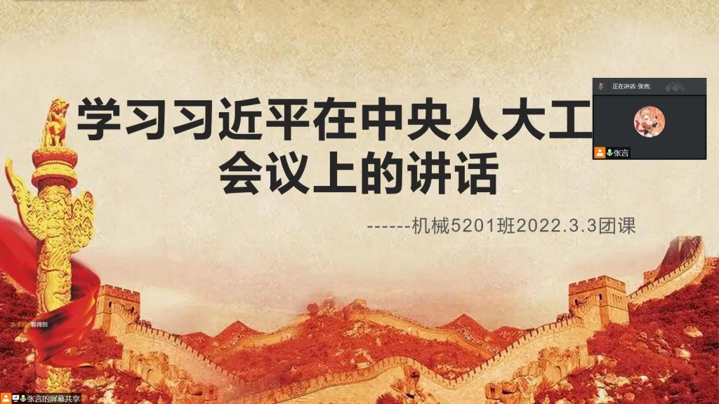 本网讯(学生记者 王艺果)3月3日,在腾讯会议平台上,我系各班开展学习习近平在中央人大会议上的讲话主题团课,团课由各班团支书主持,班级全体同学参加。
