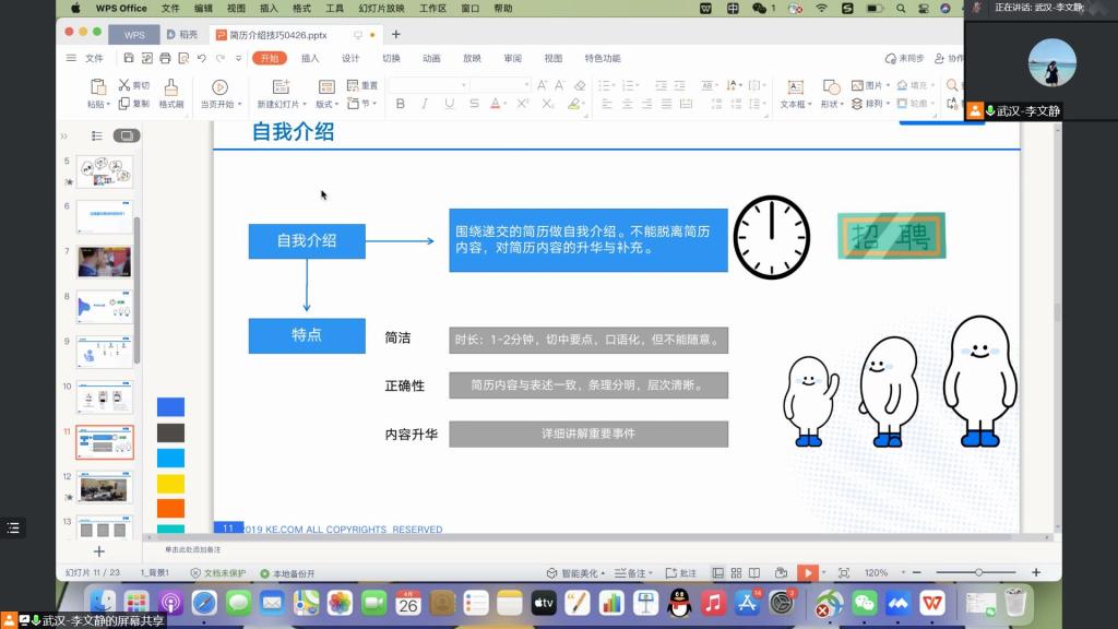 本网讯(学生记者 曲孝佳)4月26日中午,在腾讯会议平台上,我系开展了简历自我介绍技巧培训会议。会议由武汉贝壳校园招聘部经理李文静主持,系辅导员燕梦蝶出席,我系19级学生参加。