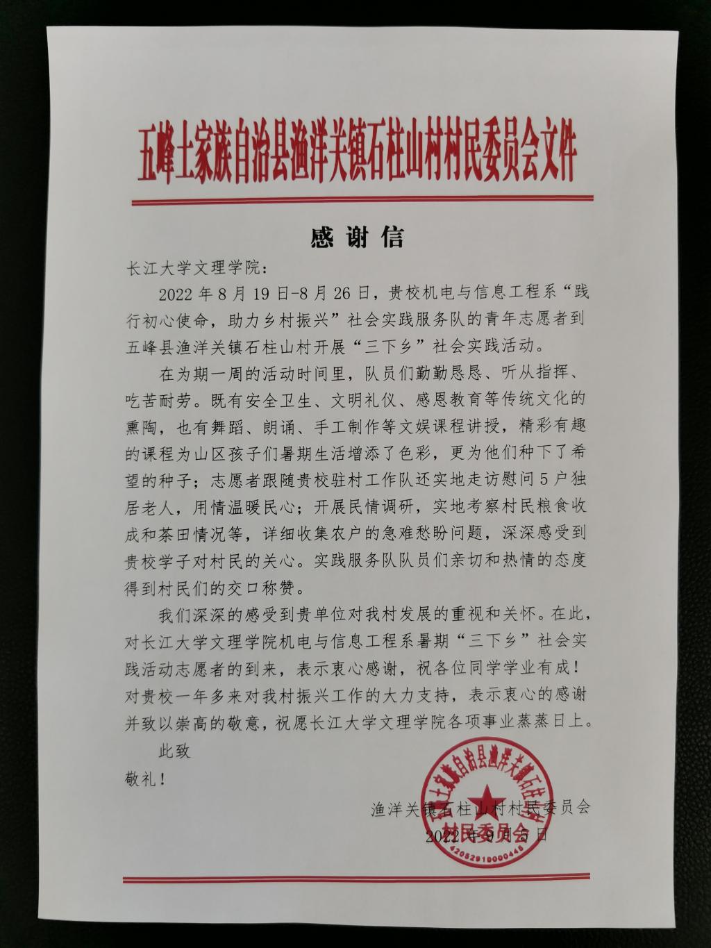 本网讯(记者 毛志豪 朱琦棋)9月5日,williamhill官网机电与信息工程系社会实践服务队收到了来自宜昌市五峰县渔洋关镇石柱山村村委会的感谢信。信中对该社会实践服务队在本次活动中的辛勤付出表示感谢。8月19日到8月26日,社会实践服务队在成观雄老师的带领下来到了五峰县石柱山村,开展本次“三下乡”活动。社会实践服务队给石柱山村的孩子们带来了丰富多彩的课堂内容和生动充实的趣味活动,助推教育振兴;开展民情调研,了解并宣传当地风土民情,助力乡村振兴;为实施乡村振兴战略和构建基层治理新格局培养后备人才,增强社会责任;以实践行动传递爱心温情,增强当代青年大学生的责任与担当意识;协助村委会举办文艺汇演,宣传民族特色,引领文化振兴。