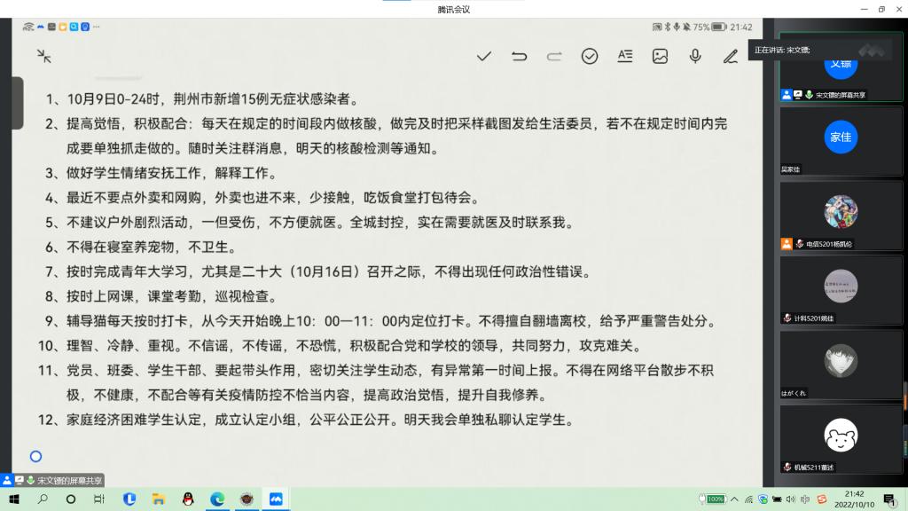 班会上,主持人通过宣读《我理解 我行动》相关文件,围绕“上课安排”、“核酸排查”两个方面,向同学们讲述了学院实施各项疫情防控措施的必要性和紧迫性。辅导员要求同学们完成每日辅导猫定位打卡和核酸检测,不得擅自翻墙离校;封校期间学会减压,做好心理调适,保持积极乐观的心态;注意寝室卫生,做到勤打扫、常通风。他提醒学生干部们发挥模范带头作用,严禁在网络上发表不当的言论,不信谣、不传谣,主动做疫情防控的“践行者”。