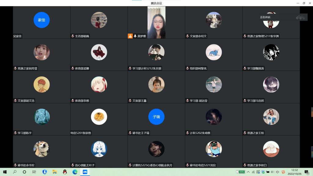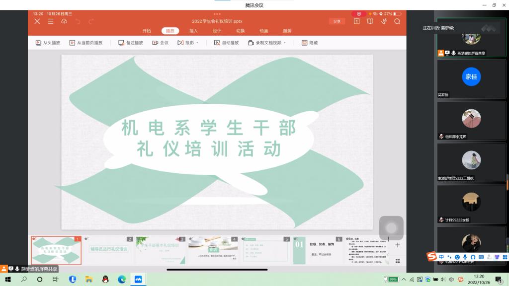 本网讯(学生记者 李学哲 王鑫)10月26日,在腾讯会议平台上,我系开展学生干部基本礼仪培训活动。活动由秘书处余书宏主持,系辅导员燕梦蝶主讲,第十八届团学组织全体成员及各班班委参加。