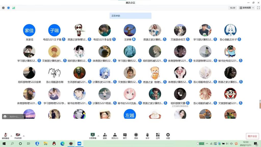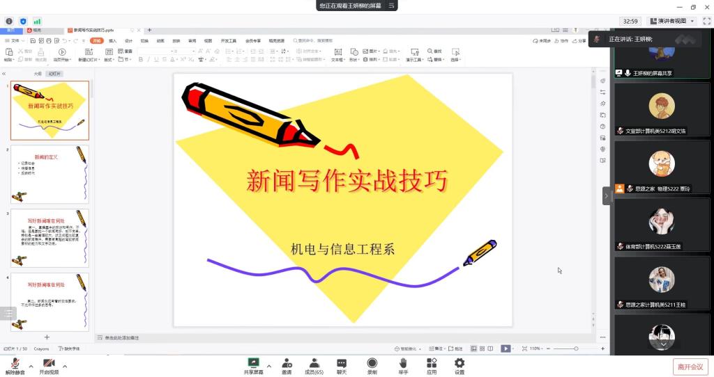 本网讯(学生记者 余绍文)11月11日中午,我系通过腾讯会议开展线上新闻稿撰写培训会,培训会由辅导员王妍柳主讲,第十八届团学组织全体成员参加。
