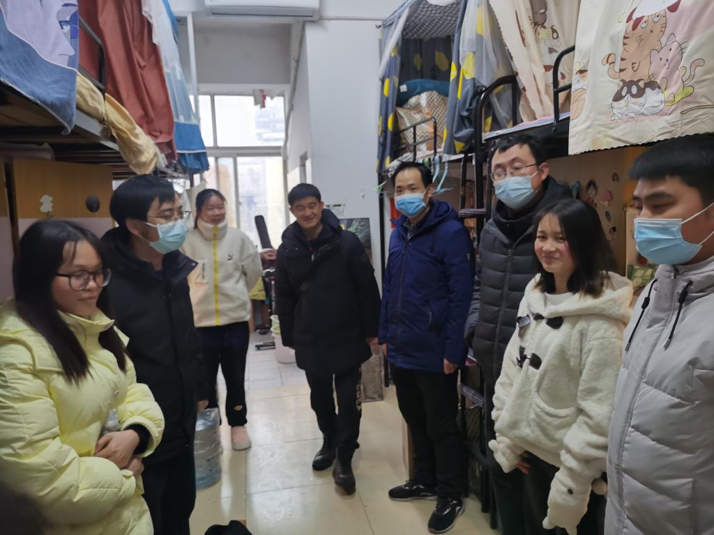 本网讯(学生记者 黄盼盼 杨天磊)新学期伊始,为全面掌握学生返校后的思想动态和心理状况,帮助学生更好地调整状态、适应新学期的学习生活节奏,2月12日下午,我院院长付兵、党总支书记吴海良、常务副院长陈希湘、副院长呙明辉以及党总支副书记成观雄深入走访学生宿舍,为同学们送上暖心关怀和细心指导。