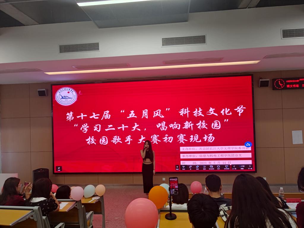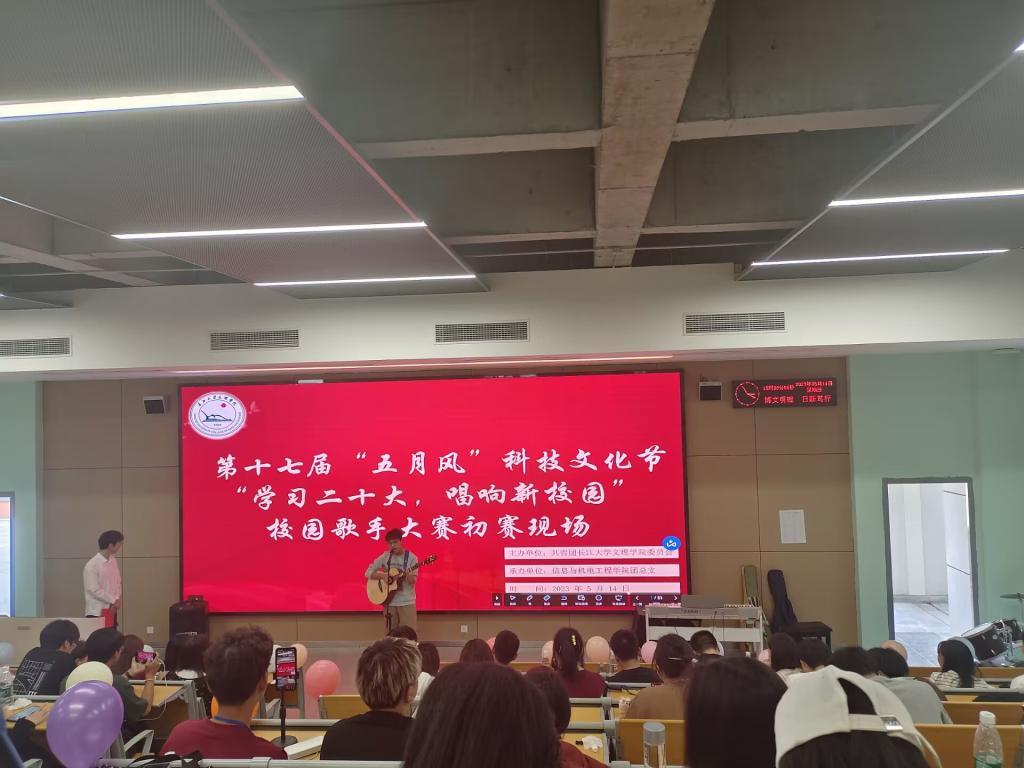 本次比赛设立线上观看渠道,通过抖音平台对初赛现场进行直播。比赛开始,主持人致开幕词,晋级选手依次登台演唱,为同学们带来《词不达意》、《年轮》、《阴天快乐》、《追》、《我怀念的》、《黑夜和白天》等曲目。选手们通过独唱、合唱、自弹自唱等形式展现了他们各具特色的声线,舞台上歌声悠扬动听,舞台下喝彩加油声不断,现场气氛热烈,充分展现出了当代大学生蓬勃的精神面貌和较强的艺术感染力。
