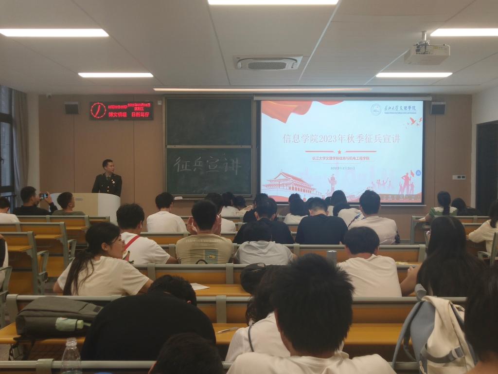 本网讯(学生记者 吴家佳)为加强征兵宣传的力度,鼓励同学们积极参与征兵,5月31日,我院开展2023年秋季征兵宣讲活动。会议由现任老兵团蔡小康主持,辅导员宋文镖出席,我院200余名师生参加。