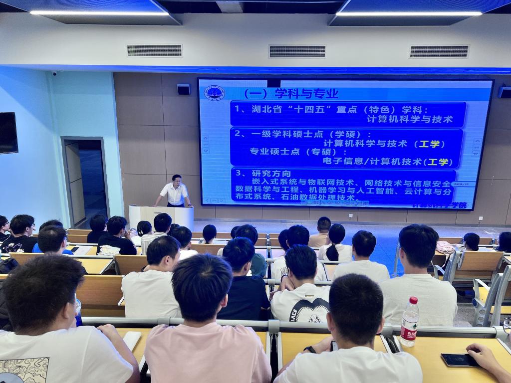 在讲座中,刘波涛教授围绕 “计算机专业研究方向”、“科学研究实验环境”、“科研导师队伍”、“研究生招生信息”等几个方面,向同学们介绍了长江大学计算机科学学院在人才培养和实验设备上的优势,并对计算机专业考研的相关内容进行了细致讲解。随后,他针对长江大学计算机科学学院的考研政策,向同学们传授了备考技巧,他鼓励同学们积极备考,制定合理的学习计划,积极寻求提升与进步。最后,刘波涛教授向备考学生送上了美好的祝愿,殷切期盼大家成为优秀的计算机专业人才,为社会的发展做出更大的贡献。
