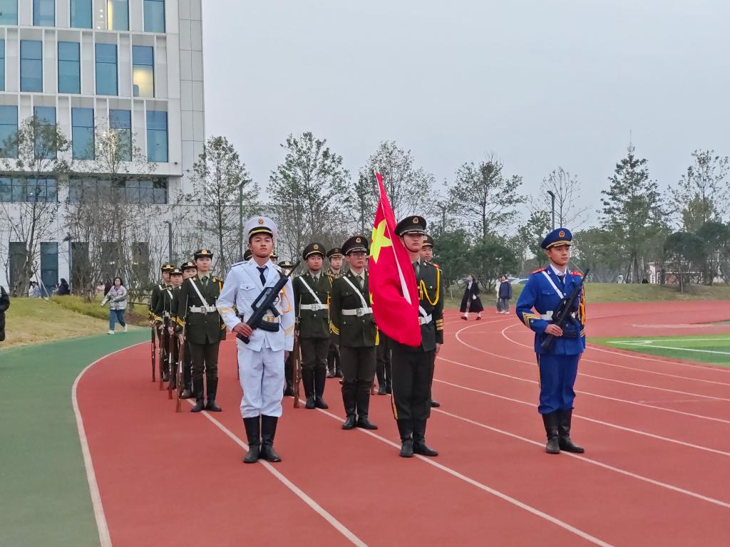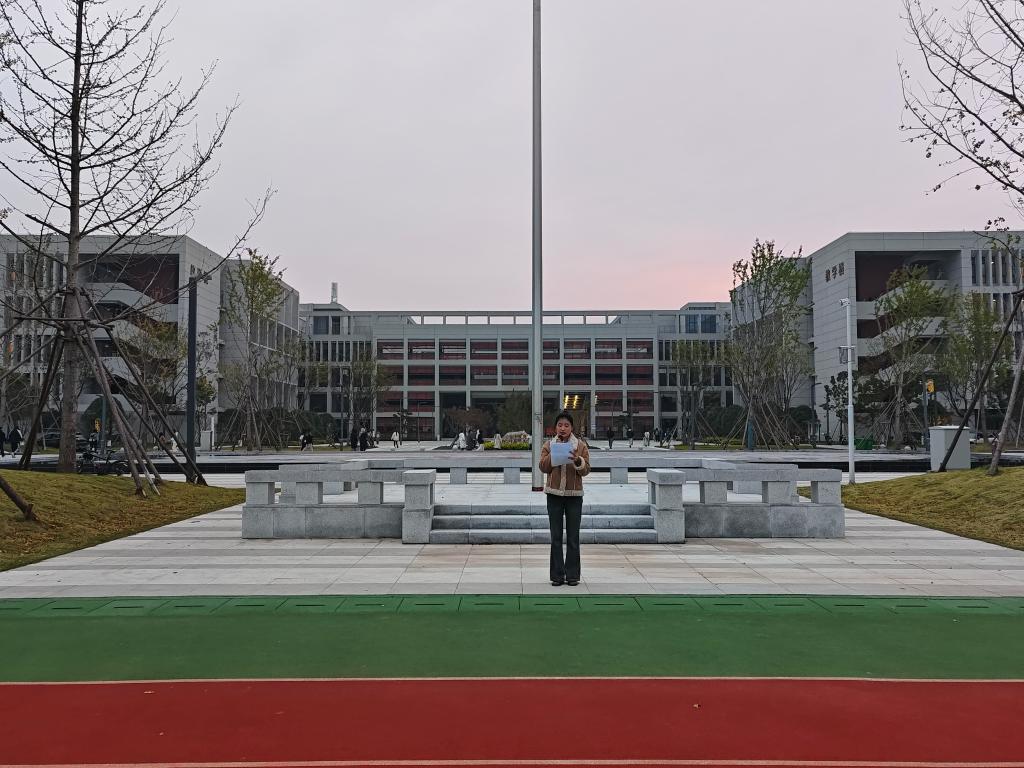 升旗仪式开始,国旗护卫队同学穿着军绿色仪仗队服,共同护卫着五星红旗向升旗台缓步前行,当嘹亮的国歌声响起,全体师生抬头注视缓缓升起的五星红旗。随后,学生代表物理5222周烁迎发表演讲,她以“非学无以广才,非志无以成学”强调良好学风的重要性,并用“紧起来,严起来,动起来,跑起来”作提倡,号召大家一起共建优良学风。