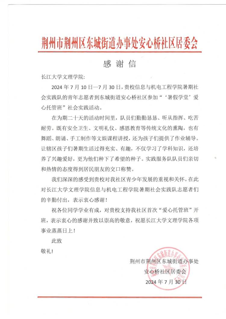 荆州区东城街道办事处安心桥社区居委会近日向学院寄来感谢信和感谢状,信中对我院社会实践服务队的辛勤付出、卓越表现给予了高度的肯定和赞扬,并对williamhill官网给予社区青年发展的重视和关怀表示感谢。