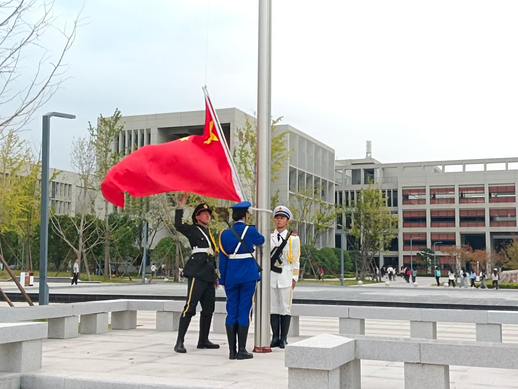 清晨,我院师生列队齐整,七点整,国旗护卫队着统一制服,英姿飒爽,迈齐步护卫国旗走向升旗台。在庄严国歌声中,国旗飘扬升起,我院全体师生肃立致敬,齐唱国歌,表对祖国的热爱与敬意。