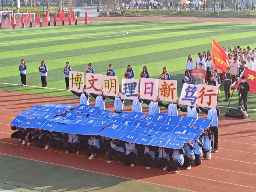 运动会在激昂的运动员进行曲中拉开帷幕,我院60人方阵队迈着矫健的步伐出场,空中键盘书写“博文明理,日新笃行”,展现了我院青春激昂的运动风采。