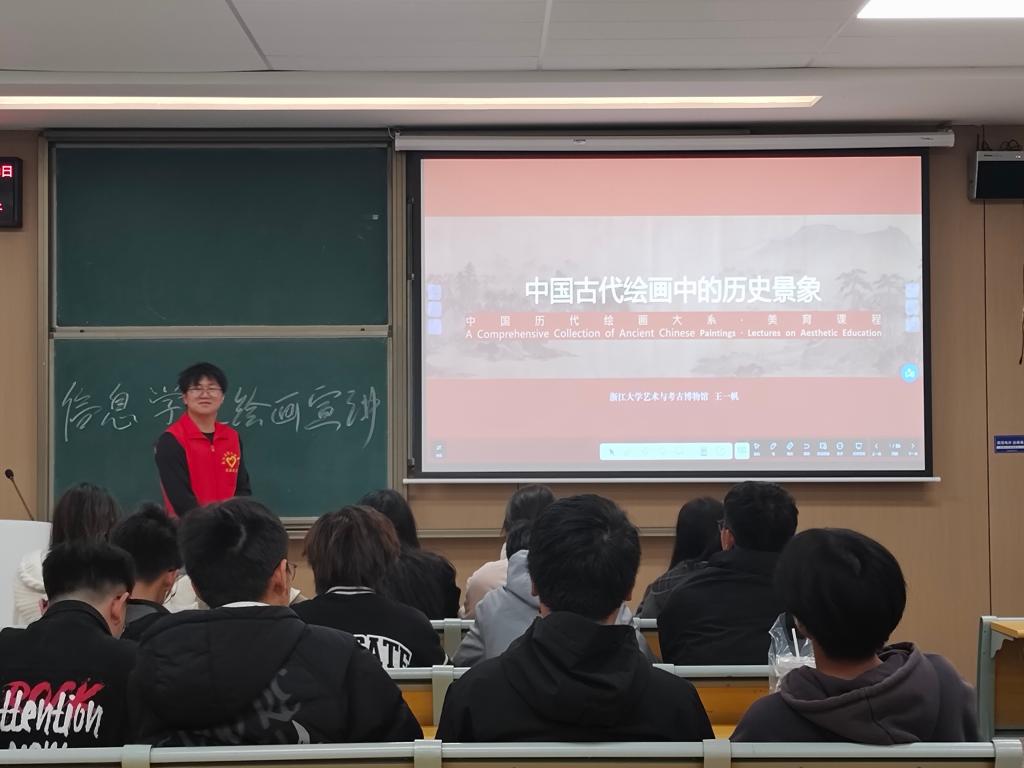 本网讯(通讯员 刘秀/文 蔡浩文 吴祎 江博伟/摄)为让当代大学生了解画作背后的故事和价值、增强他们对优秀中华传统绘画文化的兴趣,我院于11月27日下午在教学楼C-218开展“绘彩千秋韵,志愿传画情”绘画宣讲活动。