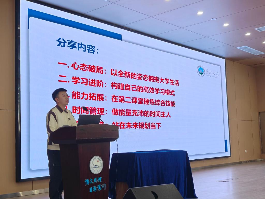 本网讯(通讯员 孙齐/文 孙齐 姚泰峻 /摄)学院于11月13日在B-112学术报告厅开展“领航·优秀校友面对面”新生入学教育,特邀2017级计算机科学与技术专业优秀校友、长江大学石油工程学院在读博士研究生(硕博连读)熊梦园作分享。院党总支书记吴海良、党总支副书记王大专出席,2025级辅导员代表韩雪莹、赵伟薇及大一新生参加。分享会由王大专主持。