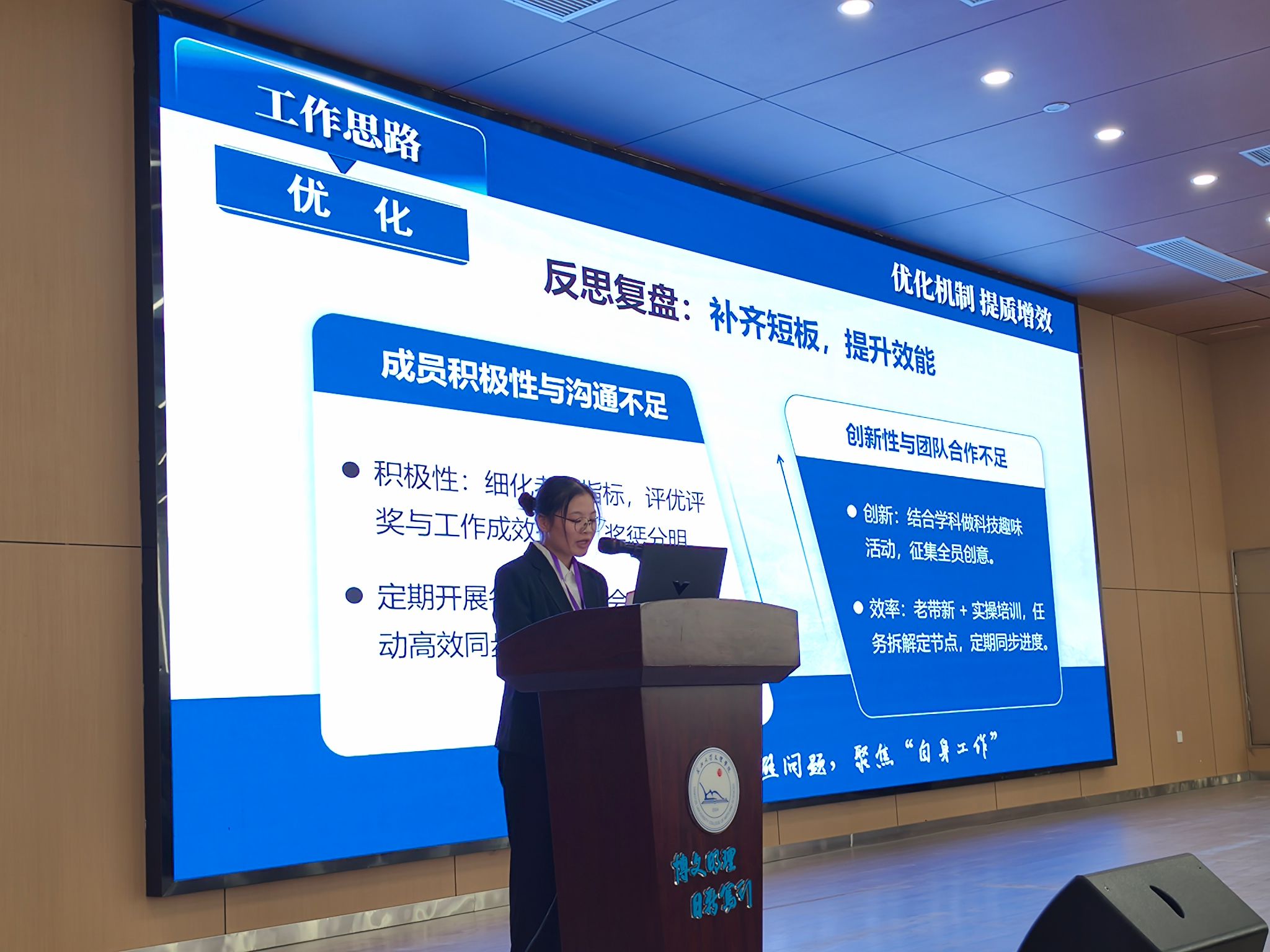 表彰结束后,各部门负责人依次做本年度工作汇报,深入剖析成果与不足,并提出切实可行的改进方案。学生会主席团代表邓书婷作年度工作报告。她强调,学生干部须始终牢记服务宗旨,聚焦同学需求,持续优化工作机制;未来将着力从机制完善、活动创新、服务提质三方面深化探索,让团学工作更有温度、更具实效。