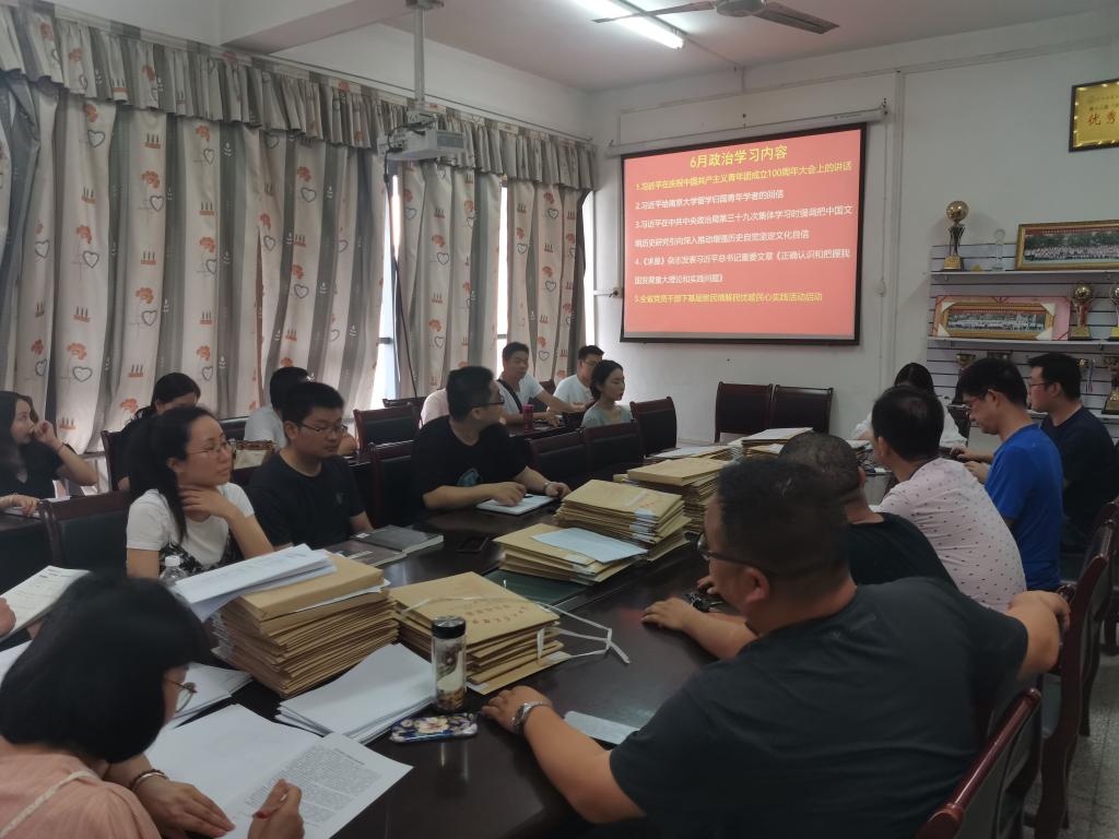 本网讯(通讯员 成观雄)6月23日下午,我系教工党支部在会议室开展6月份政治学习和“支部主题党日”活动。会议由教工党支部书记呙明辉主持。