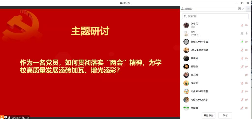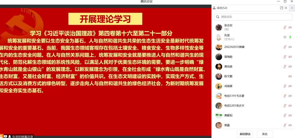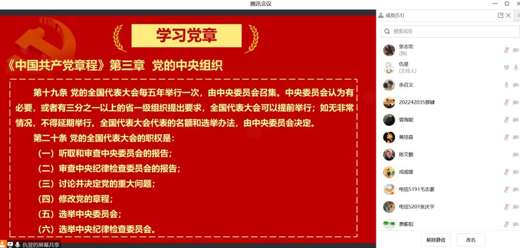 本网讯(学生记者 张志宏)3月28日中午,在腾讯会议,我院学生党支部开展3月份政治学习和“支部主题党日”活动。会议由仇昱同志主持,学生党支部书记成观雄出席,支部全体党员参加。