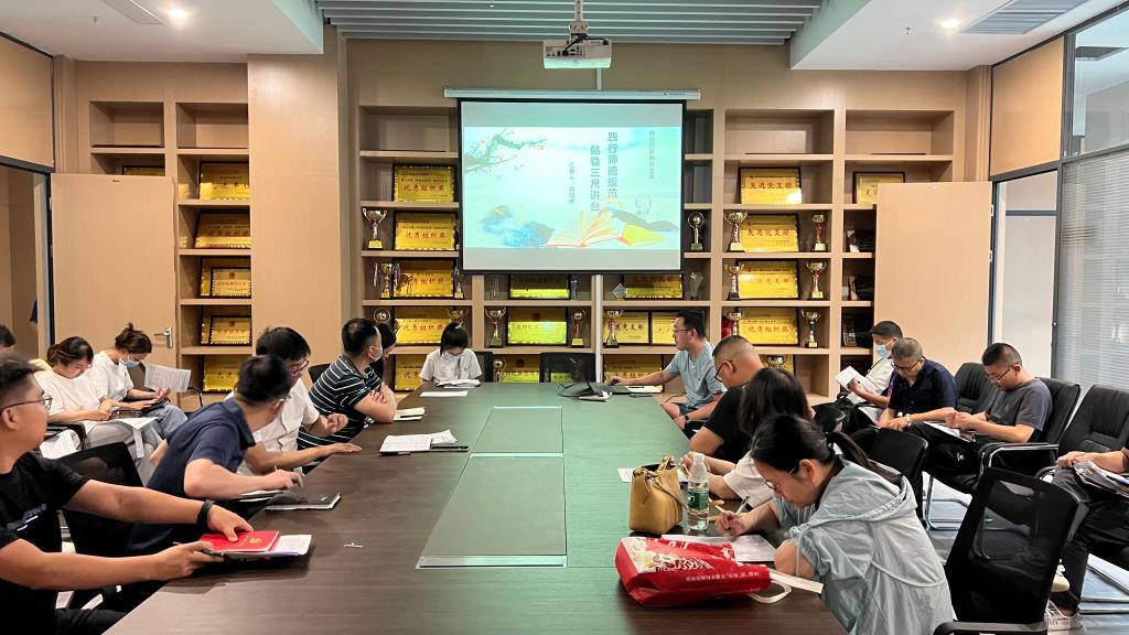 最后,呙明辉以“践行师德规范,站稳三尺讲台”为题讲党课,他从“上善若水,厚德载物”、“教师为什么要践行师德规范?”、“教师如何践行师德规范?”等三个方面进行了论述,对国内外师德教育进行了剖析,最后号召大家从爱国守法、爱岗敬业、关爱学生、教书育人、为人师表、终身学习等六个方面来践行教师职业道德规范。