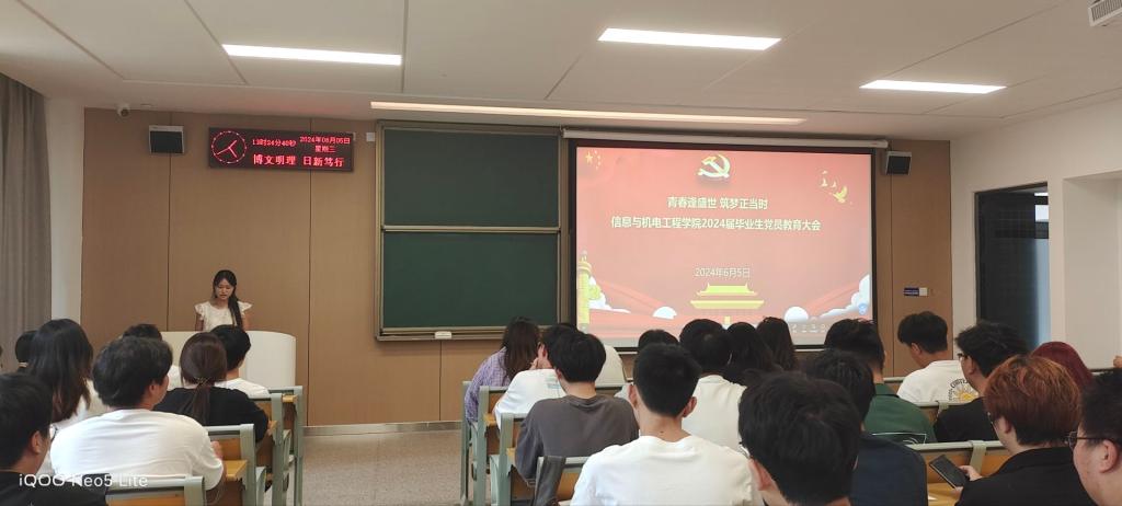 本网讯 (通讯员 孟娜/文 孟娜/摄) 为进一步强化毕业生党员教育,激励毕业生党员坚定理想信念、牢记党员的身份,帮助毕业生党员做好从学校到社会的角色转变,6月5日,我院于A-208教室开展“青春逢盛世,筑梦正当时”2024届毕业生党员专题教育,我院党总支书记吴海良、学生党支部书记王大专、毕业生辅导员出席,全体毕业生党员参加。