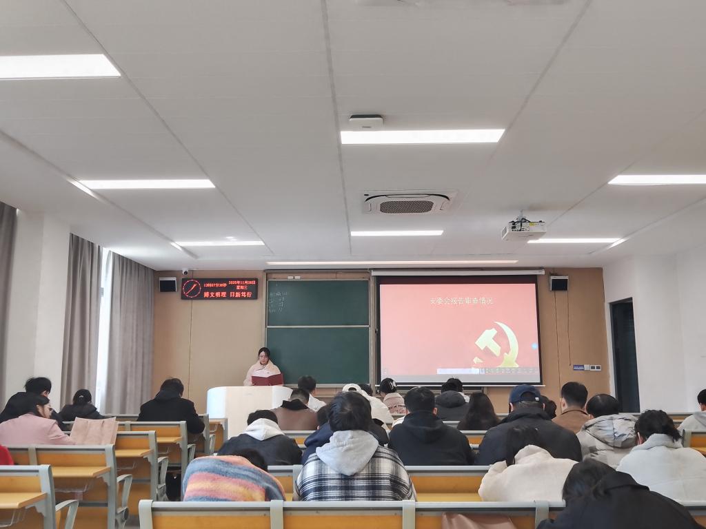 本网讯(通讯员 赵秋丽)11月26日中午,学院学生党支部在C-122教室召开预备党员转正大会。会议讨论表决周烁迎、何坤、周锋、李娜、郑少平5名同志转为正式党员事宜。辅导员王妍柳主持会议,支部成员与培养考察人一同参与。