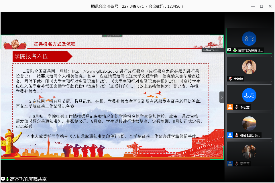本网讯(学生记者曲孝佳)为加强征兵政策宣传力度,鼓励大学生入伍参军,5月17日晚,在腾讯会议平台,我系开展2020年大学生线上征兵宣讲活动。300余名师生一同参加。