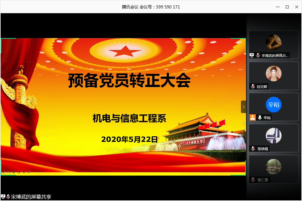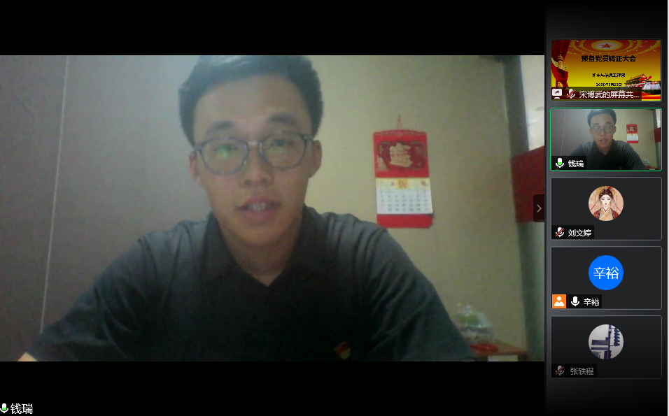 本网讯(学生记者 刘文婷)5月22日中午,在腾讯会议平台,我系学生党支部召开线上预备党员转正大会。会议讨论表决宋聪聪、吴神鞭、杨小丰、钱瑞、熊梦园、刘文婷六名同志的转正事项。系党总支副书记辛裕主持会议,相关培养考察人一同参与。