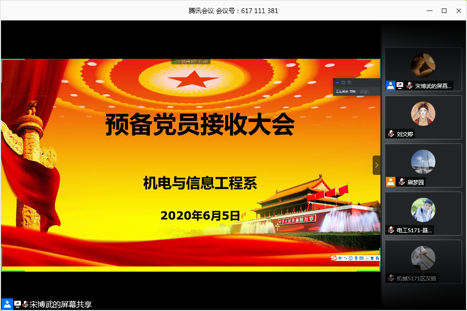 本网讯(学生记者 刘文婷)6月5日中午,在腾讯会议平台,我系学生党支部召开预备党员接收大会。会议讨论陈锟、区汉铭、聂雅兰、张萍、刘豪杰、孙文静、余召义七名同志的接收事项。系党总支副书记辛裕主持会议,相关培养考察人一同参与。