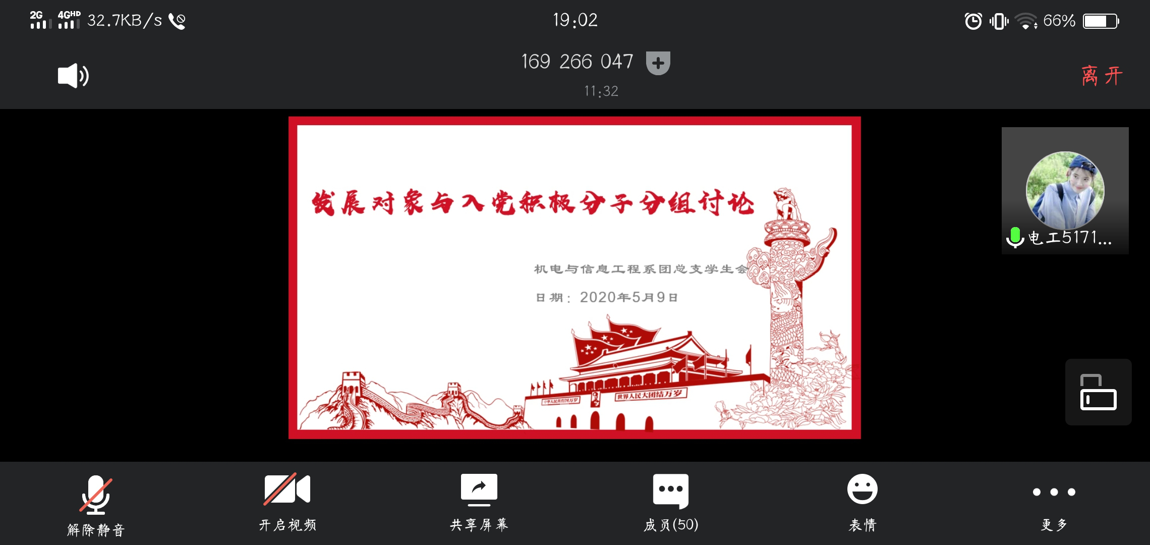 本网讯(学生记者 李丹)为规范做好党员发展工作,切实加强入党积极分子、发展对象和预备党员的培养教育,5月9日晚,在腾讯会议平台上,我系开展2020上半年分组讨论活动。会议由电工5171聂雅兰主持,我系10名预备党员、6名发展对象、45名入党积极分子参加。