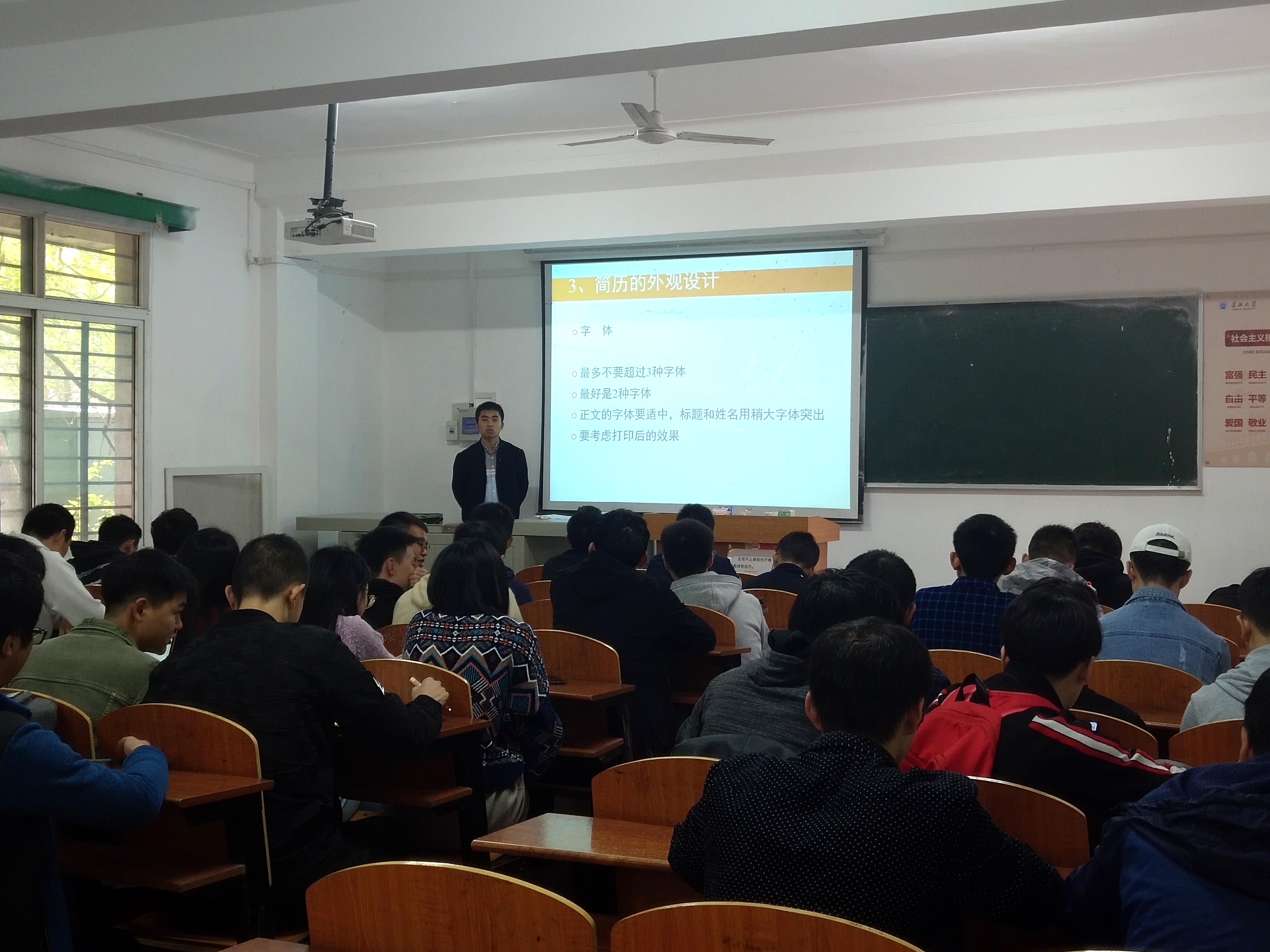 会议中,成观雄通过PPT的放映,从简历制作的目的、简历的基本内容、简历的外观设计等七个方面向同学们进行详细介绍。他向大家指出简历制作的一些常见问题,并针对性地给出解决方法。最后,他对大家提出的问题予以一一解答。