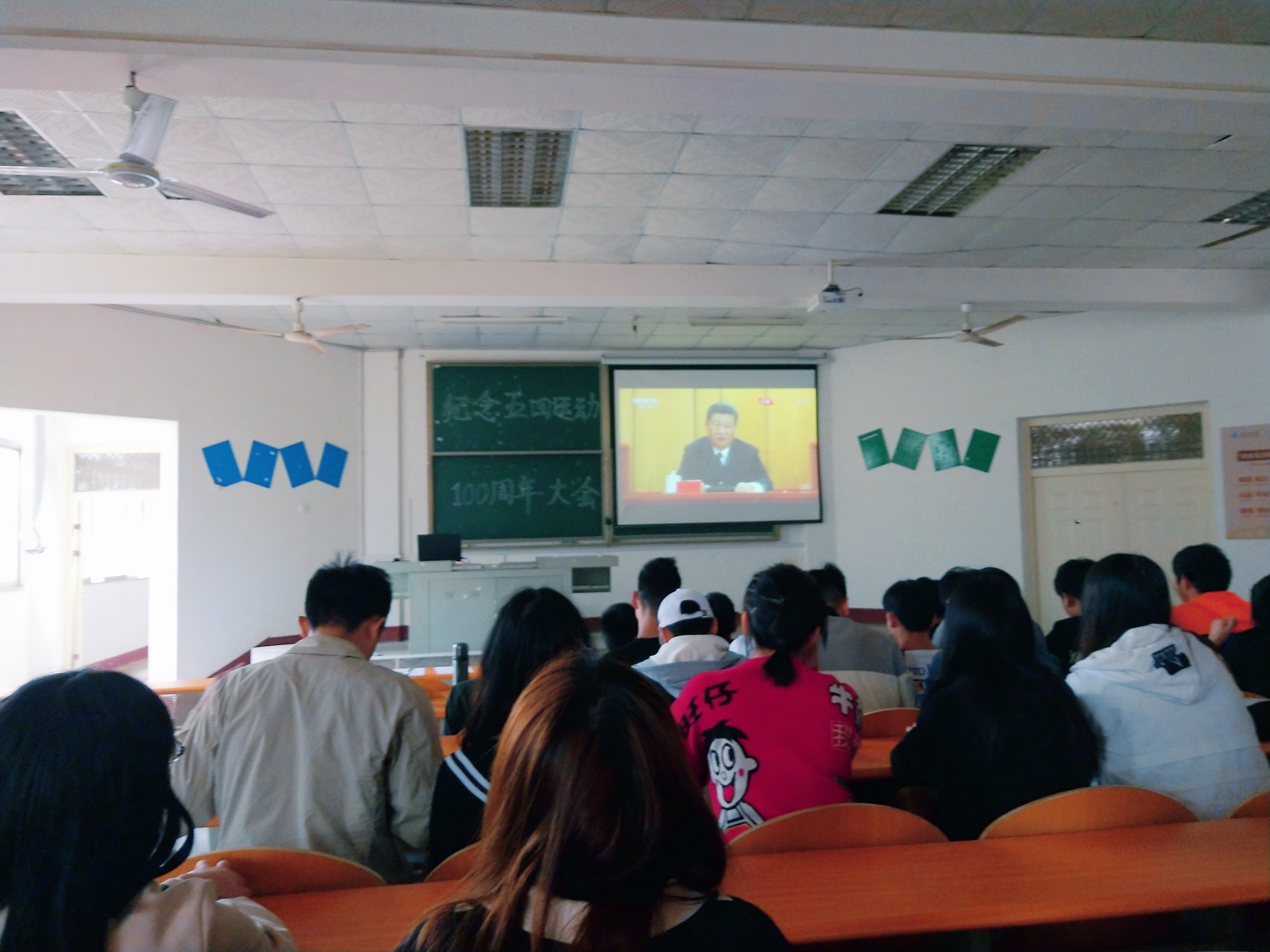 本网讯(学生记者 向东海)为了弘扬五四精神,增强新时代青年们的凝聚力,4月30日上午,在D4教200教室,我系组织学生观看“纪念五四运动100周年大会”直播。无教学安排的学生全员参加。