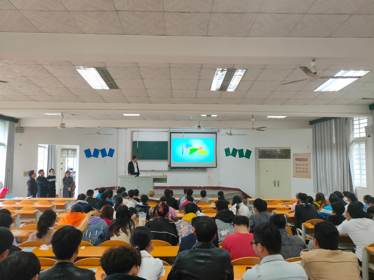 该公司人事行政综合部经理结合宣传片播放,围绕公司概况、岗位需求、科技创新、薪酬制度四个方面对公司及其分公司进行详细介绍,并结合自身经历和就业经验为同学们讲解了当代大学生的就业前景和方向。随后,公司招聘人员对应聘所需的材料和具体的流程步骤进行讲解,并对同学们提出的问题一一解答,邀请了有意愿的同学进行填表反馈。