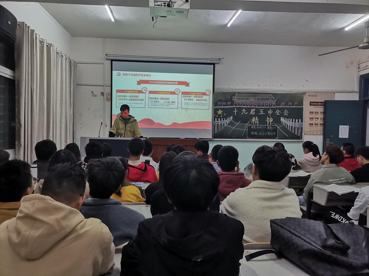 本网讯(学生记者 吴家佳)为学习宣传贯彻落实党的十九届五中全会精神,加强青年学生的思想政治教育工作,11月19日,我系各班组织开展“学习十九届五中全会精神”主题团课,团课由各班团支书主持,班级全体同学参与。