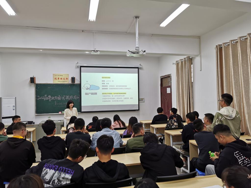 会议开始,李龙慧以沟通交流的方式与同学们积极互动,围绕“应聘准备”、“面试特点”、“面试流程”、“文明礼仪”四个方面,向同学们讲解面试时的实用技巧,并列举了面试过程中的常见问题和解决措施。随后,她通过模拟特殊情况下的面试情景,使同学们切身体验,深入了解,学习应对现场的突发状况。最后,她对同学们提出疑问予以一一解答。